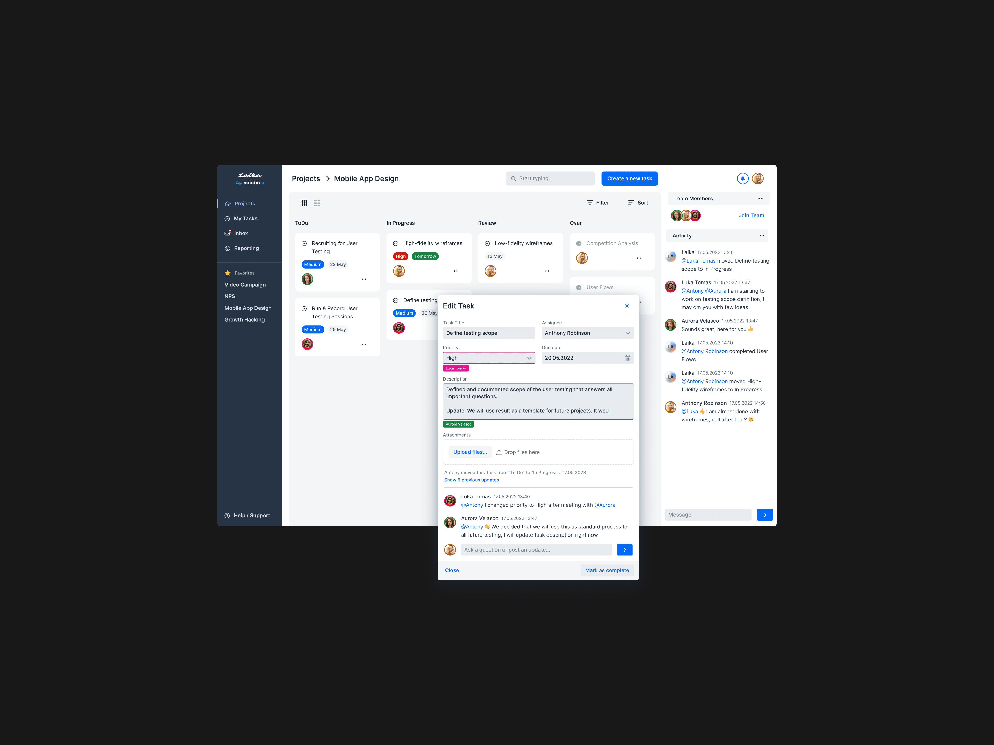 Laika was created to address these pain points by providing a simple yet powerful platform that integrates real-time collaboration, intuitive task management workflows, and AI-powered insights through its chatbot feature.